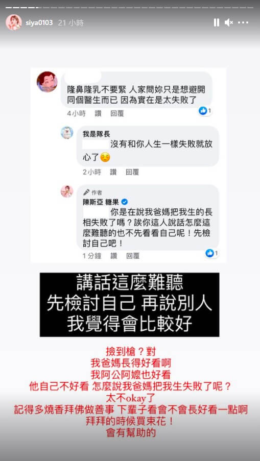 此外,也有網友直接留言表示「隆鼻隆乳不要緊,人家問你只是想要避開同個醫生而已,因為你實在是太失敗了!」而斯亞看到留言後也回應說,「你是在說我爸媽把我生得長相失敗嗎?你這人說話怎麼這麼難聽,也不先看看自己?先檢討自己吧!」