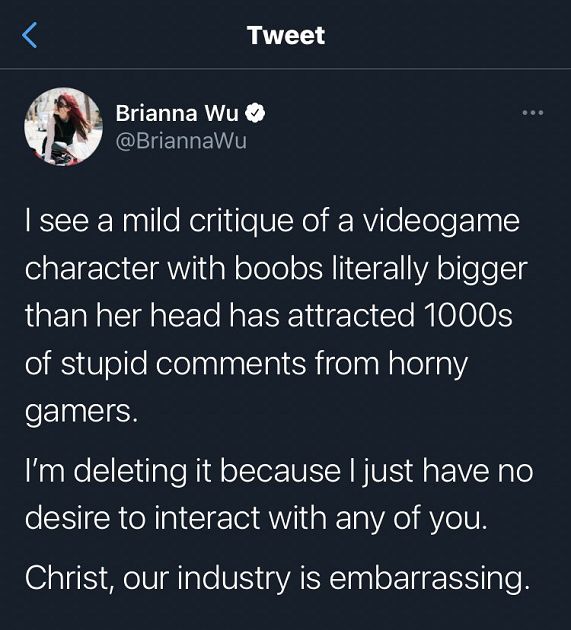 不少網友看完Brianna Wu的貼文後,紛紛留言寫下:「這個產業?你有在裡面嗎?」、「現實更多人更誇張吧」、「我的胸部比頭大,所以我不該存在嗎」等,Brianna Wu最後因為遭受巨大的輿論壓力,因此將原始貼文刪除,並再度發布貼文解釋自己是因為不想和網有吵架才刪除原始貼文,但這個解釋還是沒辦法平息網友的怒火。
