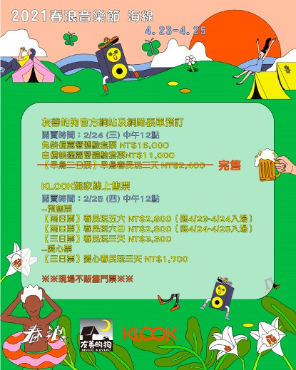 「2021春浪音樂節.海線」活動將於4月23日至25日三天在台灣最北端「半島秘境」盛大登場。早鳥票已迅速秒殺售罄,正式預售票將於2月25日中午12點在獨家售票夥伴KLOOK上開賣,可選擇兩日或三日票,兩日票價格為2,800元,可週五或週六前往,三日票售價為3,300元,輕鬆暢玩三天;此外KLOOK更推出獨家交通接駁優惠,淡水捷運站來回半島秘境(北觀處)兩日票加購價399元、三日票加購價599元,等於一個人單趟不到100元,完整資訊請參考KLOOK售票連結:https://bit.ly/3bHxVsl