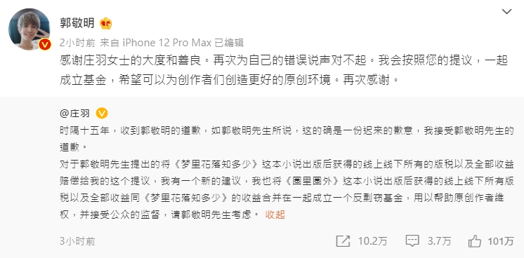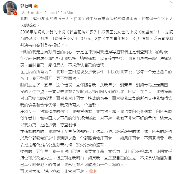 郭敬明在2020年12月31日深夜突發文針對自己15年前的作品《夢裡花落知多少》抄襲作者莊羽的《圈裡圈外》道歉,表示抄襲一事已經成為他心裡多年的陰影,遲遲不敢面對,才會一直以來避談相關爭議,如今鬆口承認抄襲,「莊羽女士,對您造成的傷害,我鄭重道歉,非常對不起。我也要像公眾道歉,向所有原創作者們,和中國來之不易的創作環境道歉,對不起,我做了非常不好的示範,請大家以我為戒,拒絕抄襲,尊重創作。」