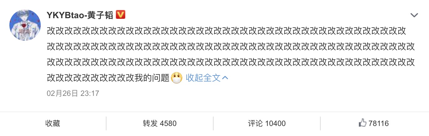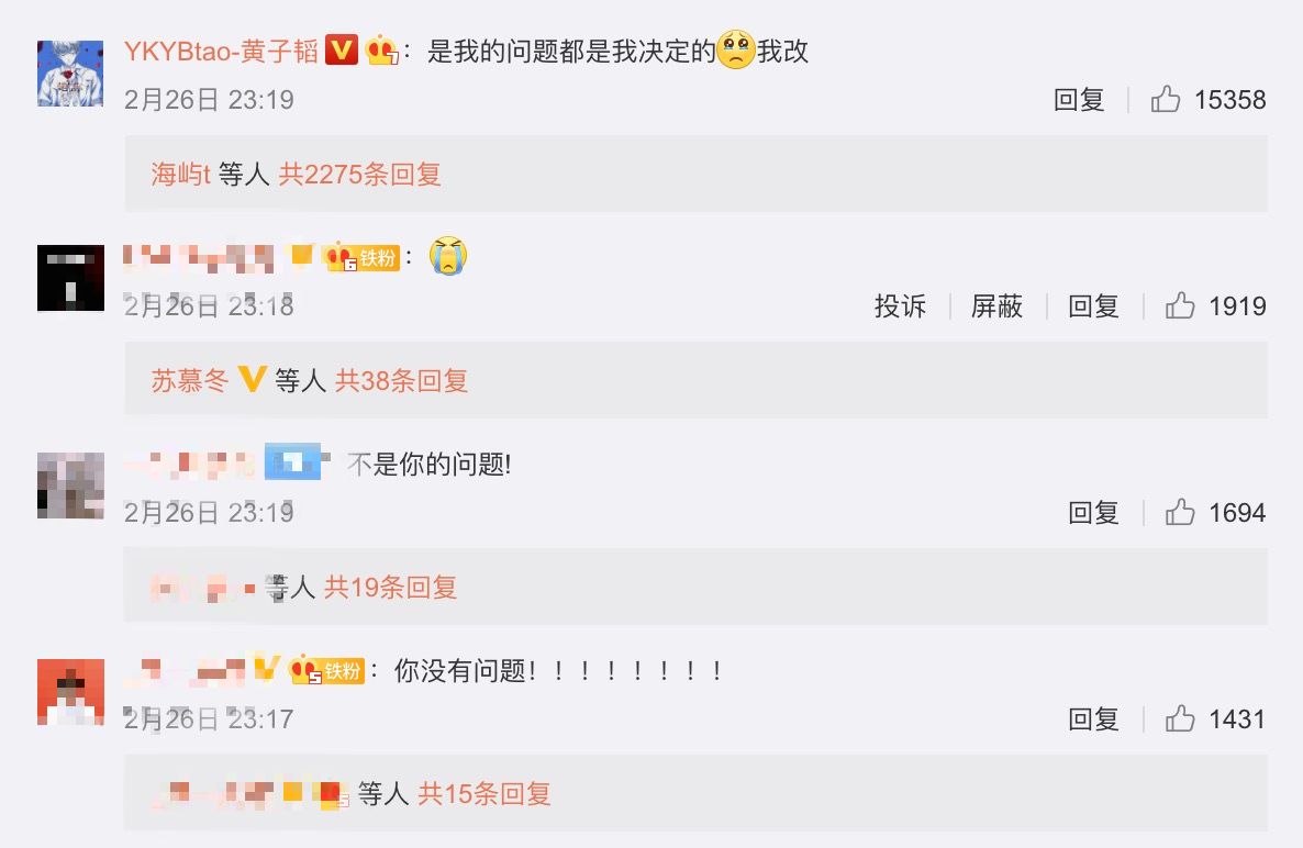 27日黃子韜透過個人微博回應造型爭議,他寫下多個「改」字,並表示:「是我的問題」,透露當天表演的造型都是他自己決定的,希望粉絲不要責怪工作團隊,以後會改進,也讓不少粉絲心疼表示:「不是你的問題」、「你沒有問題」,黃子韜的回應也立刻登上微博熱搜第一名。
