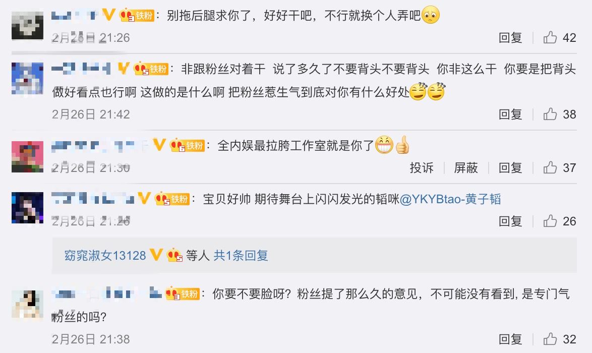 黃子韜26日參加央視元宵晚會表演新歌《後果》以及《朋友圈》2首歌曲,當天他身穿黃色西裝,將頭髮往後梳成大背頭的造型,臉上則畫上一滴「血淚妝」,沒想到這個造型卻被不少網友批評看起來很油膩、不好看,甚至連粉絲也不買單,紛紛到黃子韜工作室的微博留言抗議,希望不要再給黃子韜做大背頭的造型。