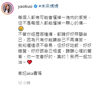 目前《未來媽媽》劇情中,郭書瑤為了孩子而嘗試人工受孕,不但身體容易不適,心靈上更是備受煎熬,因此郭書瑤也鼓勵大家,無論經歷哪種痛,都一定要好好照顧自己,聽聽心裡的聲音,一定會好的!