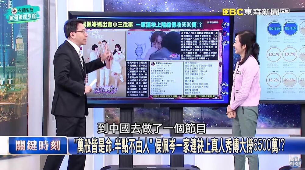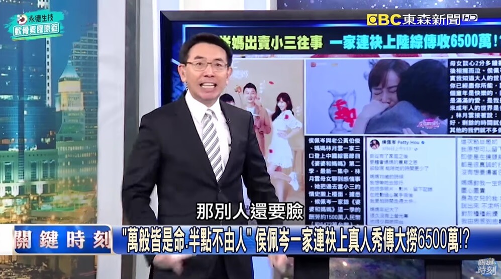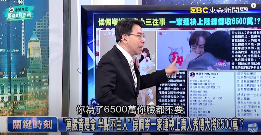 劉寶傑最近在《關鍵時刻》節目中提到了侯佩岑帶媽媽上中國真人秀《婆婆和媽媽》的事情,他嚴肅地痛批,「你家的家醜在台灣就算了,但你居然拿到中國去播,為了6500萬,臉都不要了,你不要就算了,別人還要臉!」他也認為,網友們對侯佩岑並不壞,不該往事重提,「事情過了就算了,但怎麼可以為了賺中國的錢,連這種臉都不要了!」