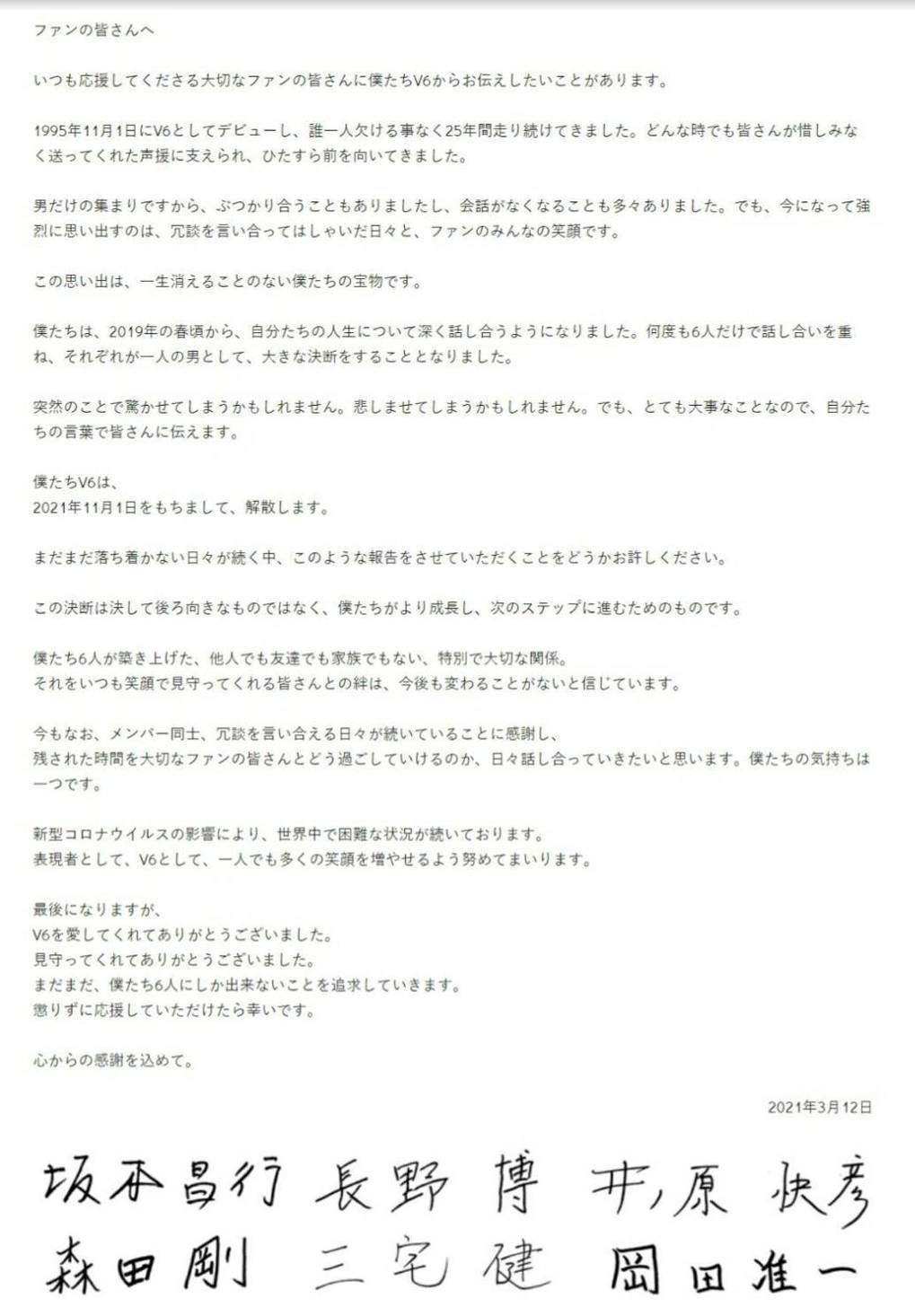 其實,V6曾坦言2019年開始,他們開展了未來人生方向的討論,沒想到最終的決定是解散團體。他們坦承:「這個決定絕不是向後退,而是讓我們更成長、邁向下一步的動力」,也了解解散會對粉絲造成不少衝擊,但是也必需無奈地公布,他們決定在2021年11月1日正式解散。