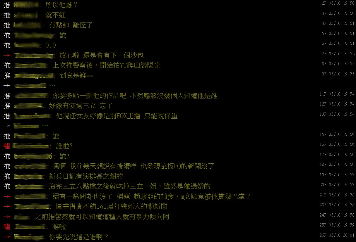 藝人趙駿亞曾因飾演2011年《新兵日記》當中的帥氣班長王威而爆紅,近期因為被傳出有兩名前女友爆料他的種種家暴事件而頻頻登上新聞版面,然而有名網友發現即使如此討論關於趙駿亞新聞案件的人也寥寥無幾,便在PTT上發起討論。