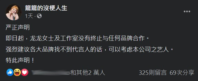 不過因應新疆棉的事件也有另一位脫口秀演員龍龍在臉書搞笑發文表示:「严正声明,即日起,龙龙女士及工作室没有终止与任何品牌合作。强烈建议各大品牌找不到代言人的话,可以考虑本公司之艺人。特此声明!」讓網友們也笑著在貼文底下留言:「笑死 在台灣...反串...要...先講... 」、「看來是想向內地發展了,字體都準備好了」、「為什麼用簡體字發文???XD」。