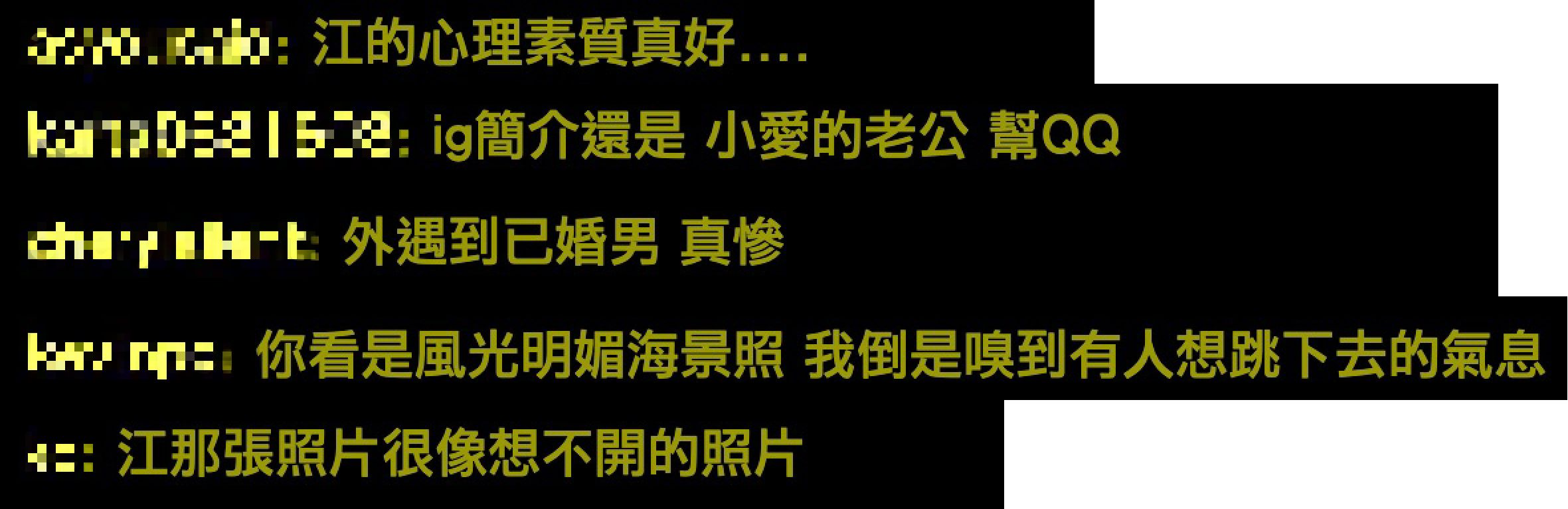 網友紛紛在論壇留言:「江那張照片很像想不開的照片」、「IG簡介還是小愛的老公,幫QQ」、「你看是風光明媚海景照,我倒是嗅到有人想跳下去的氣息」,不過也有網友認為江宏傑至今為止「心理素質真好」,認為他「值得更好的」,也有不少網友擔心家務事會影響到他在《全明星運動會》的表現,希望他能努力振作起來。