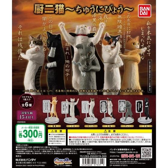 本次推出的「廚二貓」扭蛋系列共有六款,每隻貓咪都使出現實世界難以直視的超中二行為,一邊解開繃帶一邊說著「冷靜...我的右手」的中二灰貓、有著異色雙瞳並號稱自己是「漆黑的霸者」的白貓、眼睛中封印著無限黑暗默示錄的三花貓等等,中二力整個突破天際。