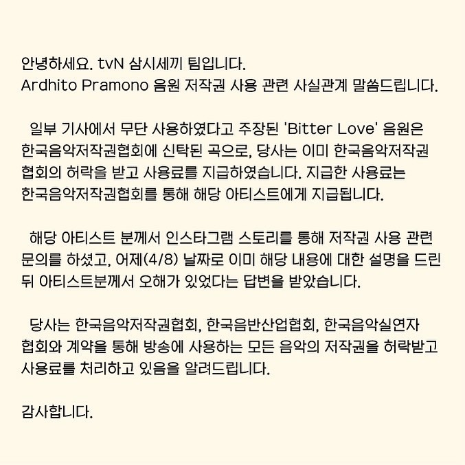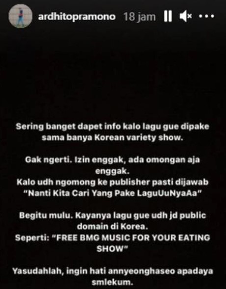 近日印尼歌手Ardhito Pramono在IG表示自己的歌曲經常被韓國的綜藝節目使用,並強調自己從來沒有授權過,也無法理解節目組擅自使用這些歌曲的用意。他也坦言一開始曾因為歌曲被韓綜使用而感到驕傲,但久而久之卻覺得自己的音樂被當成了「給你們的美食綜藝使用的免費背景音樂」,讓他十分不滿。