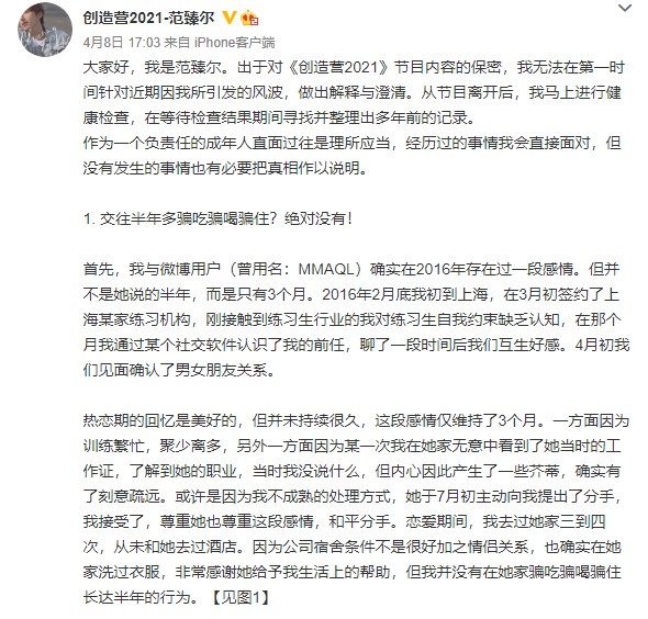 一名綽號「MMAQL」的女網友3月底曾爆出自己與一名男偶像交往,但狠批對方「是我交過最會吃軟飯的男人」,指控他在自己家騙吃騙喝住了半年多,卻又背著她腳踏N條船,還與富婆一同出遊,自己則被騙了幾百塊人民幣去幫他修手機,最後奉勸網友不要被偶像在舞台上的光芒蒙蔽了雙眼。雖然文中並未指名道姓,但不少網友都瘋猜這名男偶像就是《創造營2021》的學員范臻爾。