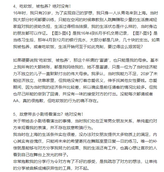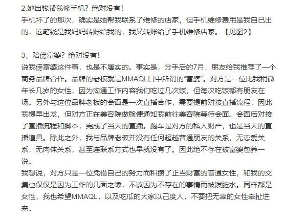 范臻爾則在8日寫下長文,表示自己之前受到節目的保密協議限制,在離開節目後才能做出回應,長文中一共列舉7點一一反擊。他先是承認自己在2016年確實曾與這名女網友交往過,但並非「騙吃騙住半年」,而是只有短短的3個月。過後他也指出修手機的費用是媽媽給的,被富婆包養一事也不是事實,他也表示「如果硬要說我吃軟飯、被包養,那這個所謂的『富婆』,也只能是我的母親。基本上我所有的大額轉帳,都是我媽給我的,她不是富婆,只是一位為了當時經濟能力不獨立的兒子一直默默付出的偉大母親。」