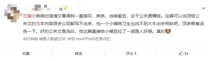 更有網友笑說:「弟弟,當啥愛豆,去幹公關更賺錢。這篇可以當頂級公關文的範本內娛很多公司都寫不出來,他一個小糊練習生也找不到大牛出手相助吧,頂多幫著潤色一下。好的公關文是洗白,他這篇直接給小糊豆拉了一波路人好感。」反而因為醜聞圈了不少粉絲。