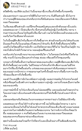 最後,First Anuwat感性發言:「這次失誤將給我一輩子的教訓」,並表示自己做好所有最壞準備,包括有機會退出演藝界。他感謝一路以來陪伴他的粉絲、女友及所有曾經幫助過他的人,然後再次為令粉絲失望和成為社會的壞榜樣而深深道歉。
