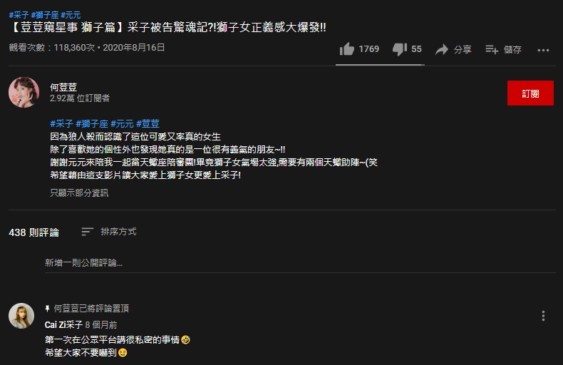 在獅子座的單元中,由於采子是獅子座的女生,荳荳邀請她來聊獅子座的個性。在影片簡介中,荳荳表示:「因為狼人殺而認識了這位可愛又率真的女生,除了喜歡她的個性外也發現她真的是一位很有義氣的朋友」,本期望這支影片可以讓大家更愛采子,不料現時竟成為反諷。