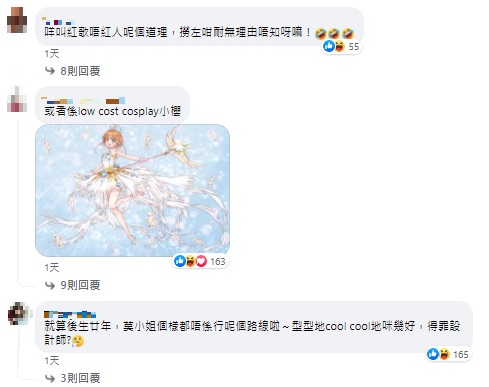 網友在下方熱烈討論,普遍網友都認為終於知道莫文蔚為什麼在香港歌比人紅,更留言嘲笑指「其實她在Cosplay百變小櫻(台譯:庫洛魔法使)」。也有網友認為莫文蔚本來走型格路線,這種甜美風完全不適合她,更懷疑她應該是「得罪設計師」。