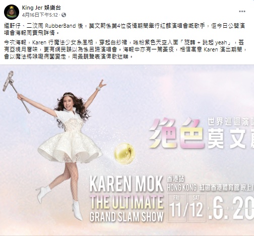 女神天后莫文蔚(Karen)早前受訪時透露今年已安排了許多計劃,除了已經錄製幾首新歌,最大的計劃是世界巡迴演唱會的最終站在香港紅館中登場。去年因為新冠肺炎疫情的關係,香港場被迫延期,最近莫文蔚就宣佈演唱會將在6月舉行。日前公開宣傳海報時,竟因其設計而被網友譏笑,帶來熱話。