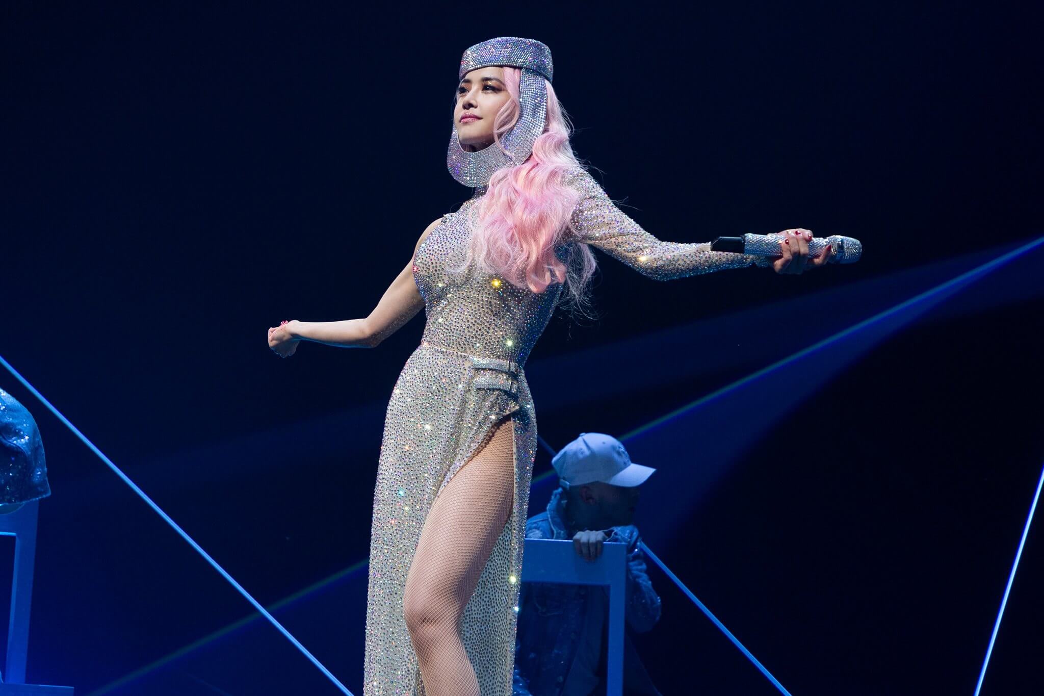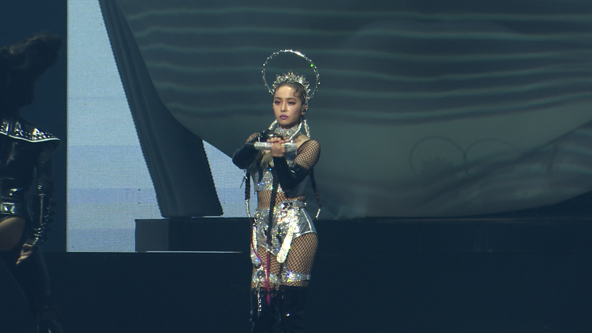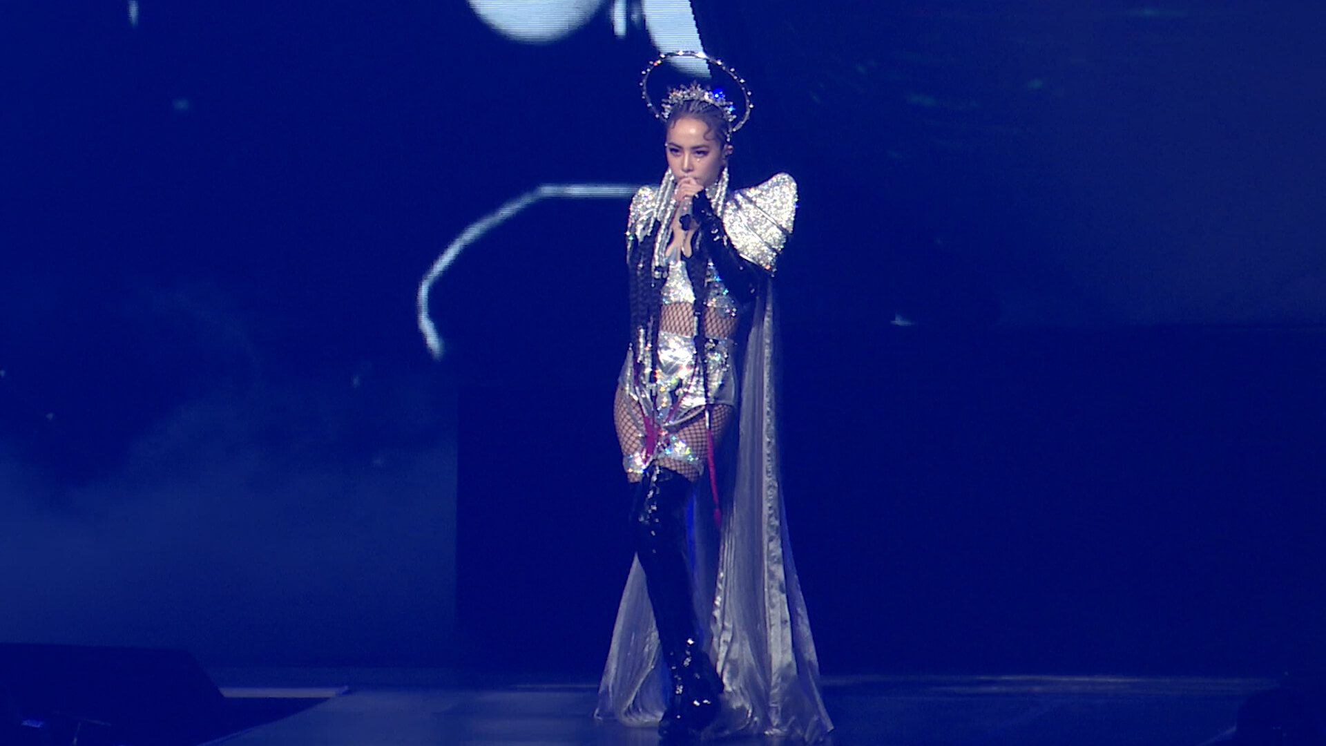在演唱會開場後,蔡依林又接連演唱了5首歌曲,全場依然尖叫聲不斷,即便Ugly Beauty巡迴演唱會已經唱過很多場,粉絲們總是能在每一場演唱會中,看見蔡依林每次都有不同的驚喜!像是這次一開場的新造型,她全身都換了新的一套設計,從原本的黑金配色,換成了銀黑配色,頭上的頭飾也跟之前不一樣,這一次的皇冠變得更加內斂精緻且高級,而她的妝容上也可以看到左眼下方有一顆閃亮的淚滴,讓現場不少觀眾看了直呼「根本聖母降臨!」、「新造型美爆了!」