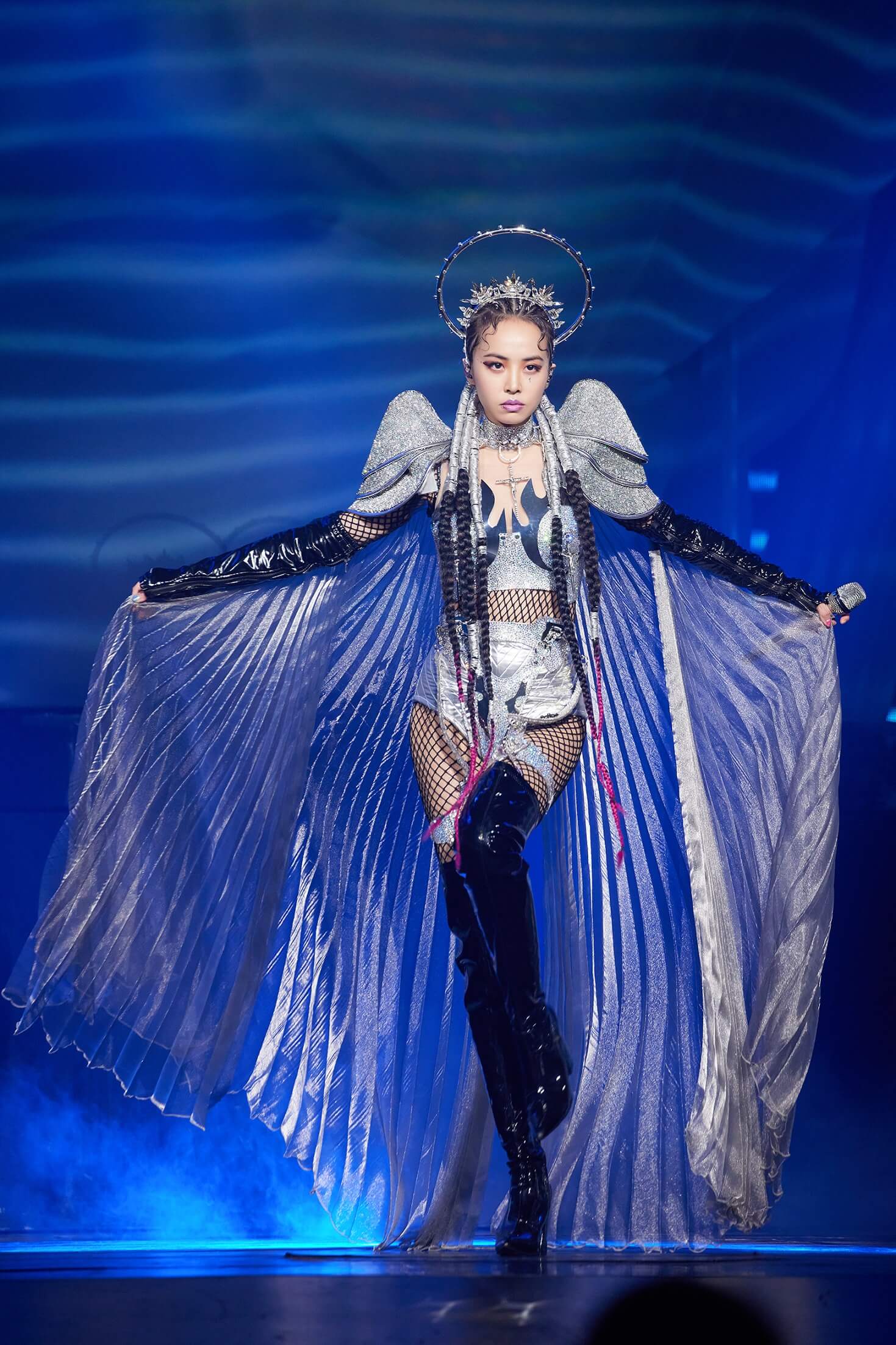 「惡之女王」Jolin回歸小巨蛋一開場就給「重量級」驚喜,為台北加演場改披「炫銀月光」戰袍上陣的Jolin,一席輝銀色戰甲宛如化身為「皓月女神」下凡,氣勢凌人依舊又散發出女神柔媚氣質,吸睛度百分百!Jolin這次Ugly Beauty巡迴演唱會的造型跟演出同樣亮眼的Jolin這次在加演場上視覺造型再突破過往極限,開場一套「炫銀月光」戰袍再度請來曾為Jolin在Ugly Beauty巡迴打造過「惡之女王黑金盔甲」及外形神似「阿聯酋空姐」等多款亮眼造型的知名設計師 Heather Picchiottino量身訂做,還特別由美國L.A空運來台,整套絕美訂製服不僅總造價就超過150萬台幣,從護盔、肩甲到唯美薄紗披風清一色以莊重又不失優雅的「輝銀色系」打造,相較過去亮金色盔甲給人的女王權威感,這套「炫銀月光」戰袍更顯女神柔媚氣質!