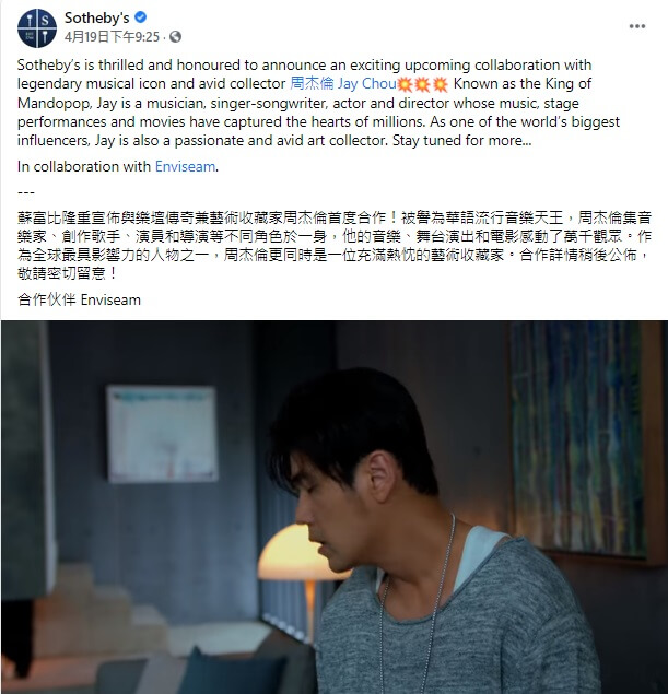 蘇富比最近在社群平台上發文,貼出了一部影片,是周杰倫演唱會跟《青蜂俠》的電影片段,並在貼文內容中寫道,「蘇富比隆重宣佈與樂壇傳奇兼藝術收藏家周杰倫首度合作!」並接著表示,周杰倫為華語流行音樂天王,他集音樂家、創作歌手、演員和導演等不同角色於一身,他的音樂、舞台演出和電影感動了萬千觀眾。
