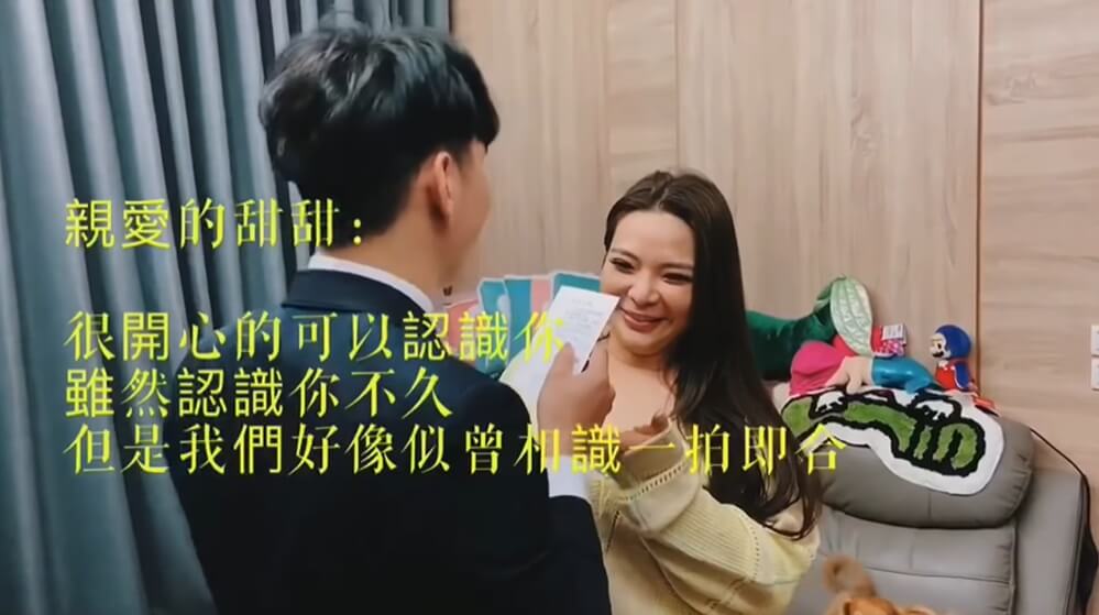 而在這段影片中,可以看到小甜甜的老公首次曝光真面目,從畫面中可看見他有一張童顏,笑起來像是溫暖的小太陽一般,而且他在準備跟小甜甜告白之前,還露出羞澀的表情,拿出事先擬好的卡片表白說,「雖然認識你不久,但我們好像似曾相似、一拍即合,總有聊不完的話題,期待往後有你的日子,你就可以在我的懷裡幸福的生活吧~」