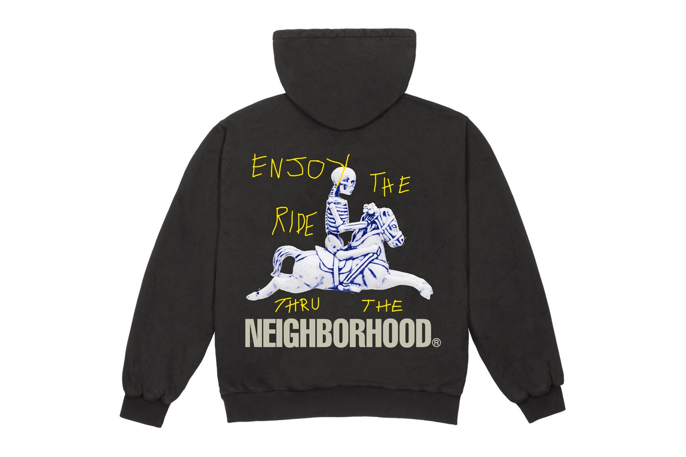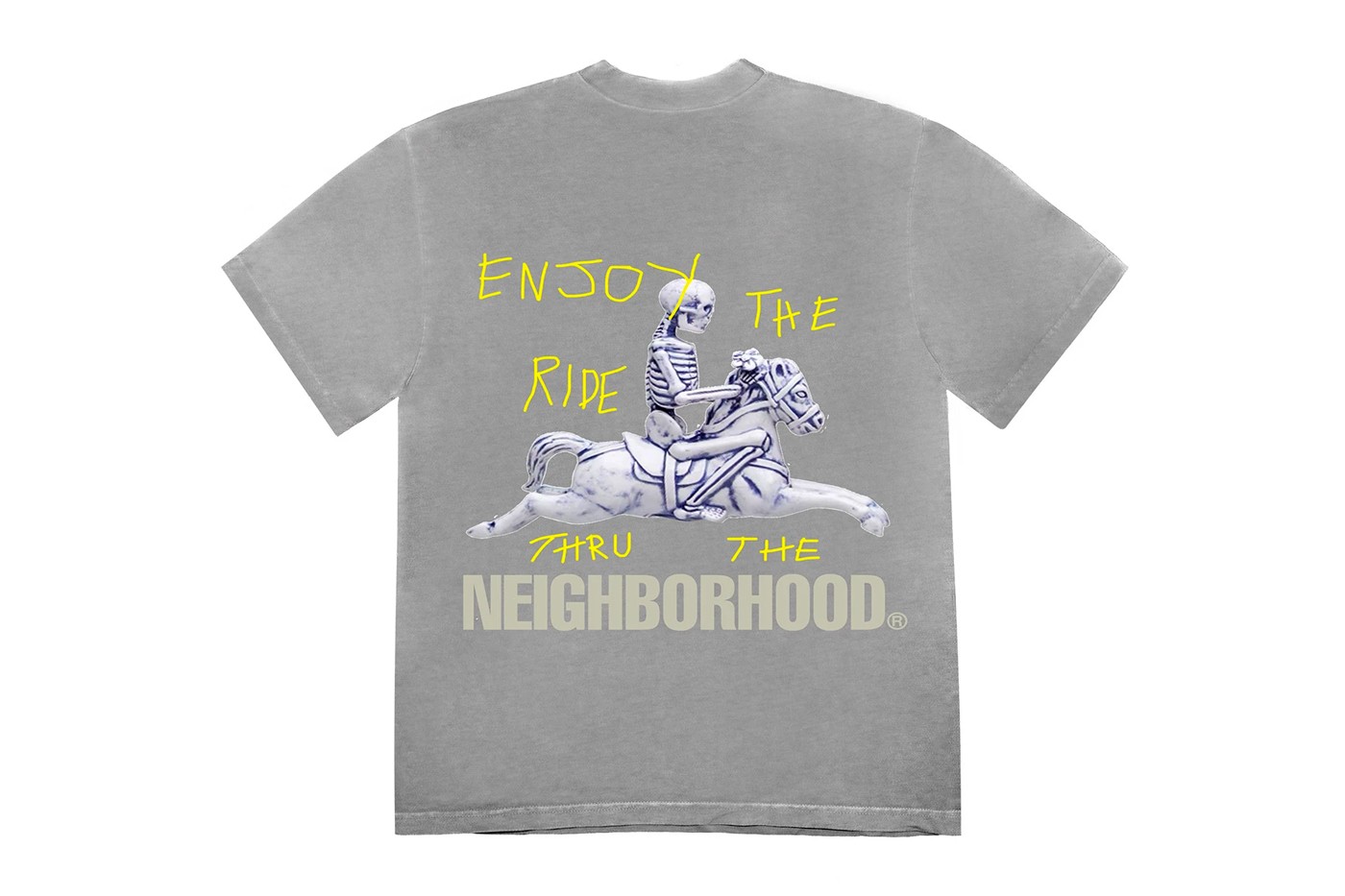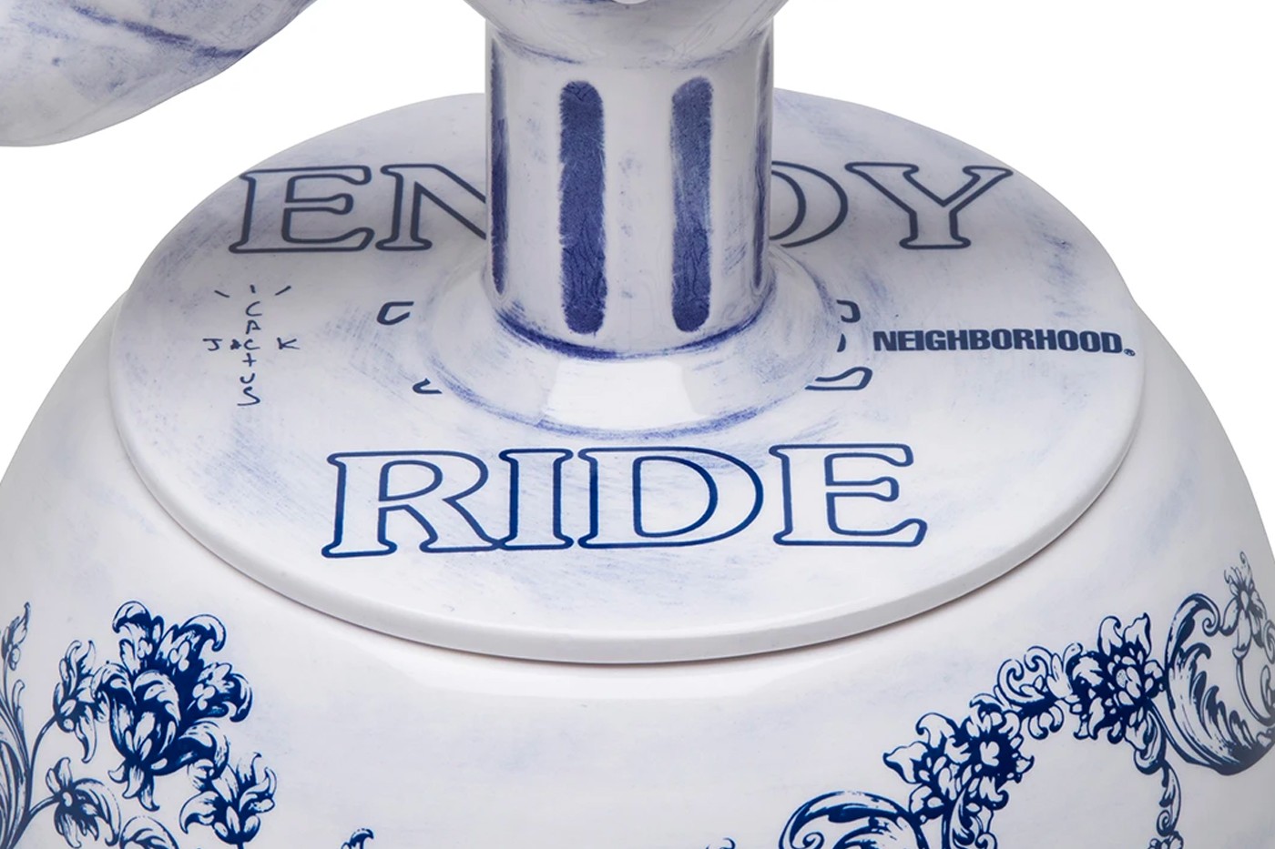 這次集結東西文化的聯名除了帶來服飾系列外,也釋出了NEIGHBORHOOD招牌的陶瓷線香座,並以骷髏騎士與花朵作為設計元素;服飾系列使用了「仙人掌傑克」的童趣不規則字體,並將線香座本體座作為背面的設計,以拼貼效果完美呈現Travis Scott的設計靈感。