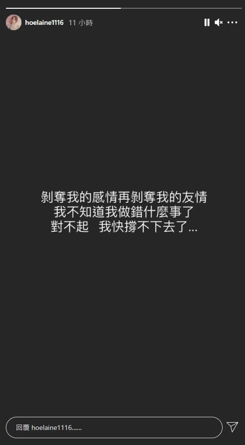 荳荳3日突然又在IG發出黑底白字的限時動態,透露出百般無奈與無助,「剝奪我的感情,再剝奪我的友情,我不知道我做錯什麼事情!」感覺得出來何孟遠的所作所為對她有很大的打擊,她也無助地寫下,「對不起,我快撐不下去了...」讓一大票粉絲們看了都非常擔心她的安危也很不捨她這樣!