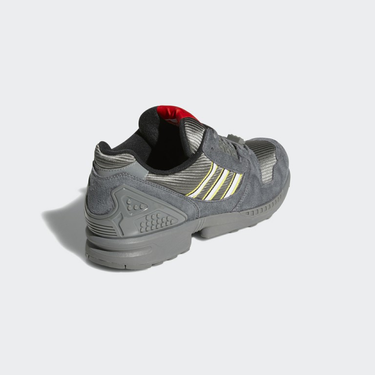 將原創版本ZX 8000系列的經典結構、材質及設計特色再放大,鞋身以網布材質搭配色彩諧調的麂皮材質拚接而成。外觀上以LEGO積木的螺柱外形設計出塑膠材質帶孔洞的片狀鞋帶扣環、樂高積木形狀的鞋帶扣,以及TPU材質的鞋跟裝飾,除了鞋舌上的LEGO品牌logo, 鞋身側面三條線標誌也以LEGO品牌logo的黃與白色設計,清楚點出LEGO聯名的品牌色彩。