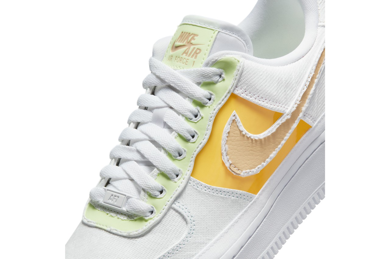 Nike Air Force 1「 Texture Reveal」及「Pastel Reveal」外觀上皆使用了純白織物包覆,僅在鞋舌上有些微差異,不過在撕裂織物材質後,鞋面下設計可說是內有乾坤。「 Texture Reveal」配色的鞋面下使用了粗織以及麻布編織材質,並佐以沙色、卡其、深咖啡色等大地色系,大玩異材質的設計相當吸睛。