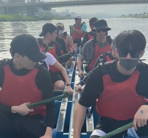 同樣身為藍隊的成員夏和熙最近也在IG上發文PO出一段影片,從畫面中可以看到同隊的張庭瑚、邱宇辰等人都穿著救生衣,一起整齊的在船上擺動身體,大家都在烈日當中認真的練習划龍舟,看起來相當熱血!而夏和熙也在貼文內容中寫道,「Who’s coming!#隊長 #等你回歸」還在貼文中Tag胡宇威的帳號。