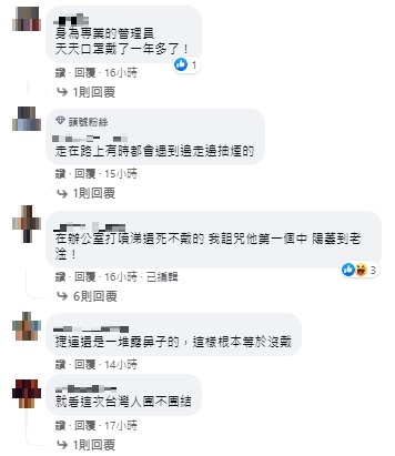 沒想到潔哥發文後,不少網友留言告訴她社區的真實情況指:「看到路上阿嬤阿北一邊大聲講話一邊流汗搧風不戴口罩...真的很恐怖」、「遇到路上的老人家沒戴比例很高」、「在辦公室打噴涕還死不戴的,我詛咒他第一個中」、「捷運還是一堆露鼻子的,這樣根本等於沒戴」等,十分讓人傻眼。
