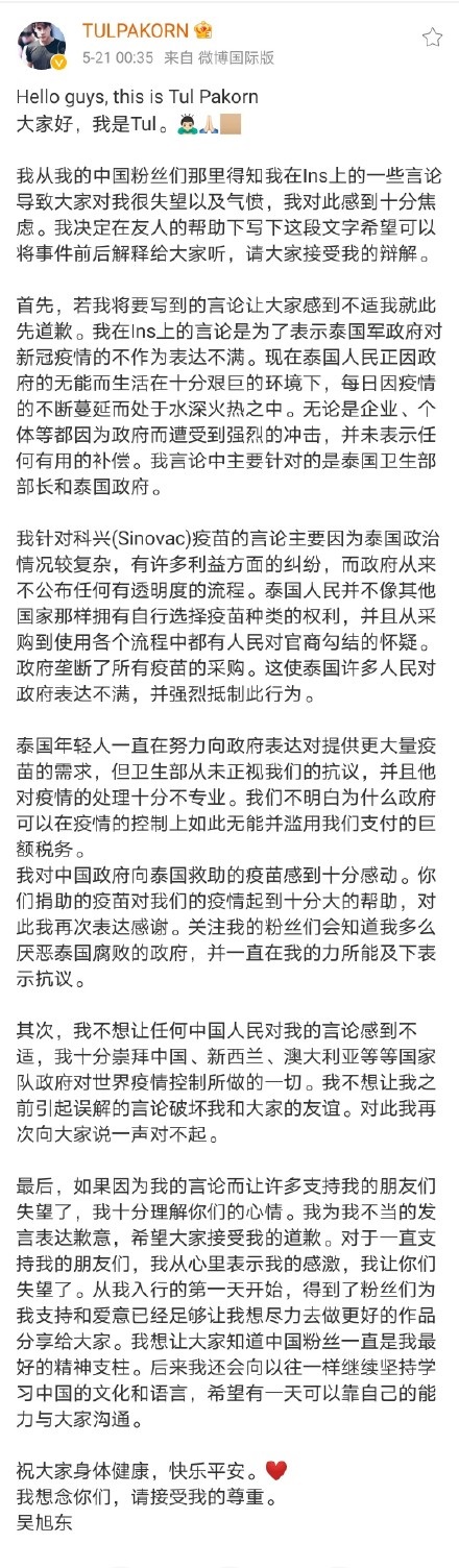 吳旭東在微博中嘗試補充解釋他的言論,他指自己是為了向泰國衛生部部長和泰國政府對疫情的不作為表達不滿。對於科興疫苗的評論,他透露自己是因為泰國政府從來不公布任何流程,對疫苗的購入沒有透明度,政府也壟斷了所有疫苗的採購等,讓他感到十分不滿而發文。