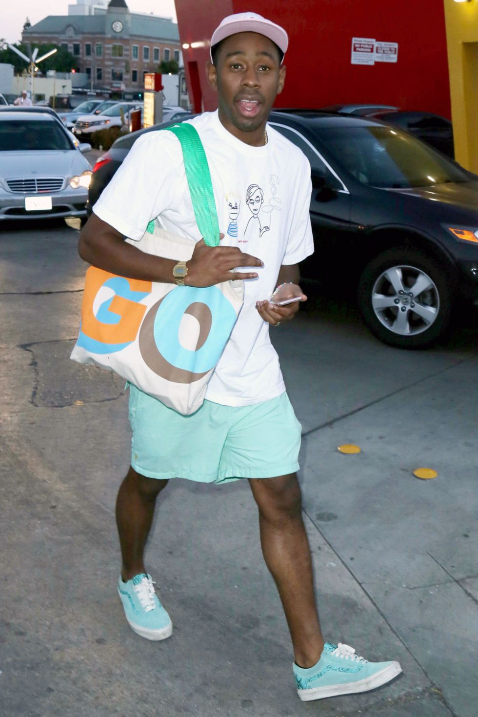 與幫派饒舌歌手的穿搭不同,Tyler的穿搭總是會以豐富的色彩作為穿搭重點,其中又以水藍、草綠、粉紅、奶黃最常出現在他的穿搭中。剛開始嘗試時不妨能以一深一淺兩種配色作為穿搭的重點,如帽子呼應褲子配色,上衣則與鞋子的顏色做搭配,整體色調便不會太過凌亂。