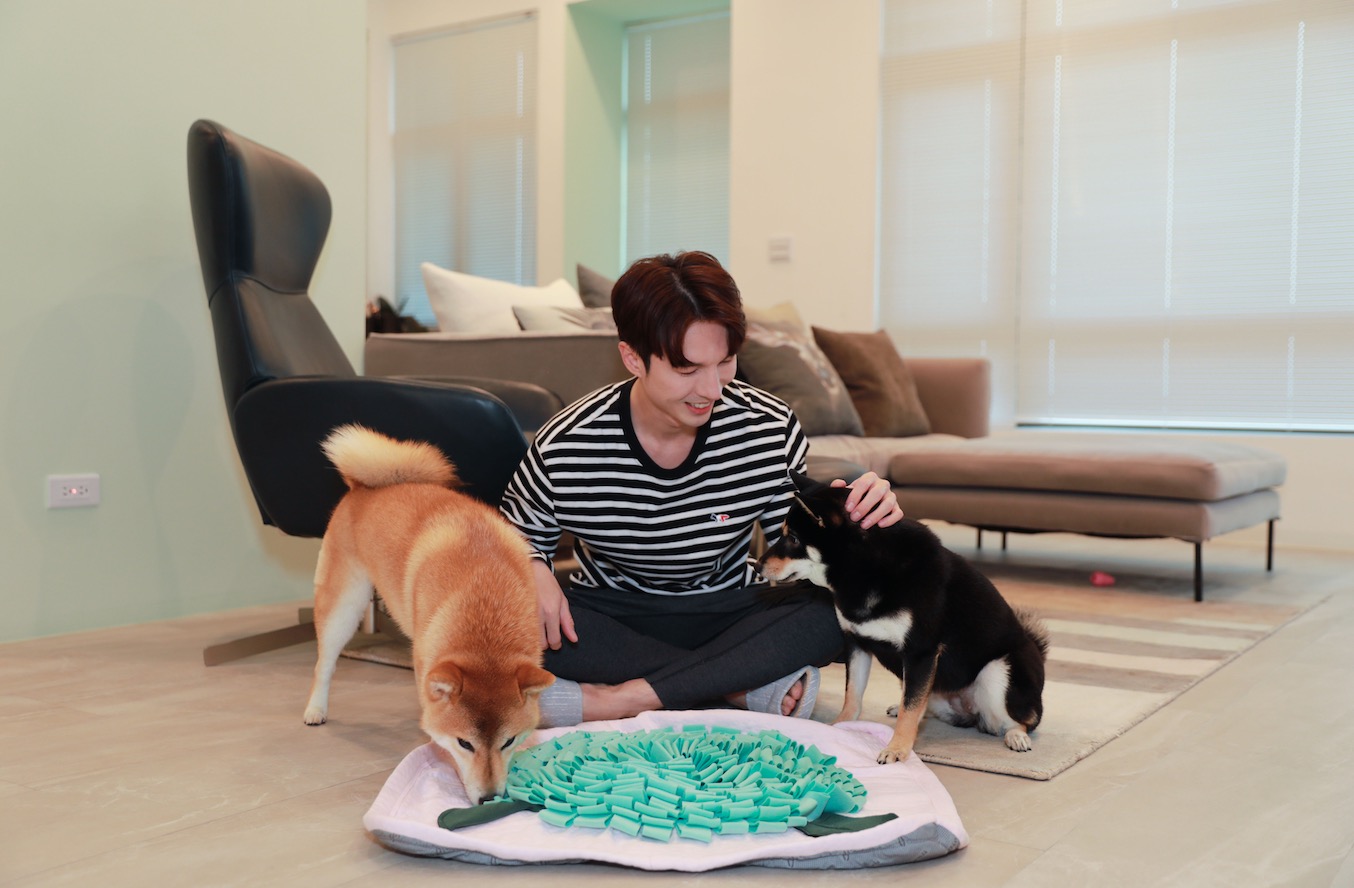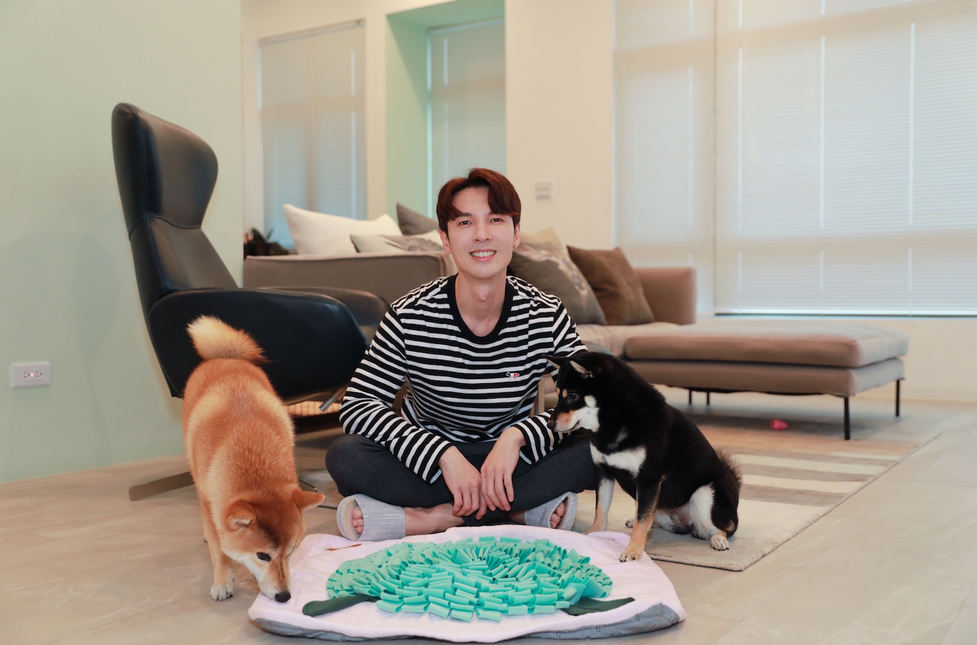 配合防疫,陳勢安都在家中透過網路與粉絲見面,也因此多了許多時間陪伴兩隻愛犬Olie和Milo,因為疫情無法帶牠們到戶外運動,陳勢安也想出辦法,運用「嗅聞墊」將牠們愛吃的零食藏起來,讓牠們在家中遊戲,做適當的運動,「因為他們都是從幼犬時就開始訓練了,所以個性很穩定,不用一定要帶出門。」不過兩隻愛犬最愛的還是跟他搶沙發,他說:「一個會坐在我頭的位置,一個坐在我腳的位置,我只好默默的往旁邊的小沙發去。」
