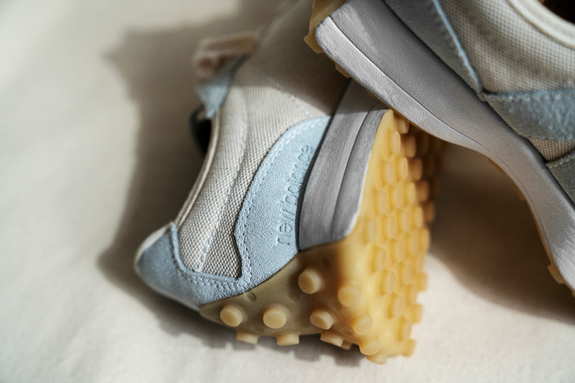被品牌視為實驗性鞋款的New Balance 327 UN-DYED,保留了材料原色,在未經染色的製造過程下,以燕麥白帆布為主體,搭配灰藍調麂皮的拼接相乘,打造出純淨自然氣息。在製程上除了減去了人工染色的工法外,也節約產製過程中洗滌用水、能量消耗和織料使用。另外,鞋底運用了白色 EVA 泡綿緩衝材料,加上受 Trail 355 鞋款啟發的未染色橡膠基底製成,提升 327 UN-DYED的舒適度,最令人驚豔的是,內裡鞋墊更改以水洗軟木鋪墊而成,種種突破性的創新嘗試,讓這只327 UN-DYED流露最原生純淨的一面。