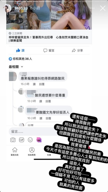 對此梓梓也發限動表示,酸民真的很可怕,第一次貓咪走失的她並不知道怎麼要金額才「合理」,同時也不知道人的善良可以用價格衡量,當下沒想太多隨意打了個數字,「怎麼做都不對,不過就是一個愛貓的心,怎麼會被曲解成這樣」。另外還有網友留言「因果報應誰叫他得罪網路酸民」,這也讓梓梓感慨,一次貓不見,可以有這麼多可怕的人,真的見世面。