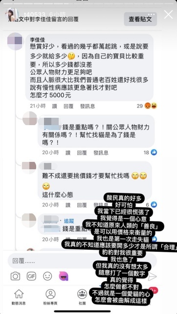 豹豹對梓梓來說就像家人一樣,梓梓尋貓的過程也感動不少人,不料懸賞海報下卻依然有酸民現身,該網友直批懸賞金額少,認為公眾人物財力應更足夠,且又有人脈,應該比普通老百姓好找很多,「怎麼才5000元」!