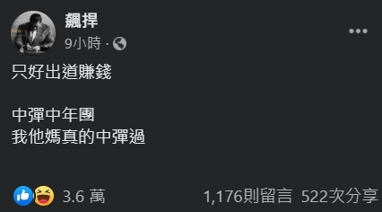 而館長陳之漢看到這波帶歪的熱潮後覺得很有趣,便在臉書發文自嘲說到:「只好出道賺錢,中彈中年團,我他媽真的中彈過。」並附上網友惡搞套餐紙袋販售品項的照片。許多網友在看到貼文後,都忍不住搞笑留言:「可以找阿扁一起組團」「中彈中年團聽起來很不妙呀」、「真的 “中彈 “ 中年團,沒中過彈沒資格加入」、「沒有防彈」、「爆裂紋是什麼鬼」,甚至還有人開玩笑表示「老了還能轉職卡彈老年團喔」。