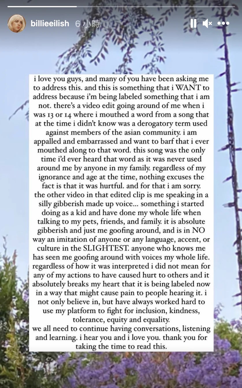 聲明中怪奇比莉首先對於事件的發生感到抱歉,並誠摯說道:「我真的感到很抱歉,我很想收回我曾經說過的話,這個詞當時是我第一次聽到,身邊的家人也從來沒有使用過這種字,但無論我的無知和年齡,都不能作為傷害人的藉口,對此我很抱歉。」,除此之外她也強調自己的口音其實並沒有模仿任何人,單純就是她自己私下會使用的奇怪口音,普遍輿論似乎對此相當不買單,也為這位新生代巨星埋下了一個難以抹去的黑歷史。