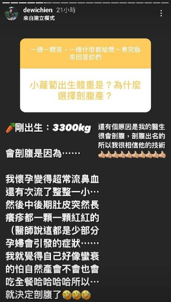 26日簡廷芮在Instagramg上發起一問一答的遊戲,透露自己在懷孕時變得超常流鼻血,有次還流了整整一個小時,懷孕中後期肚皮還會長出一顆一顆的紅色的癢疹,當時醫生也表示這是「少部份孕婦會引發的症狀」。而後簡廷芮也如此擔心自己會「吃全餐」索性選擇剖腹生產,也透漏小蘿蔔最後順利誕生,體重3300公克,相當健康。