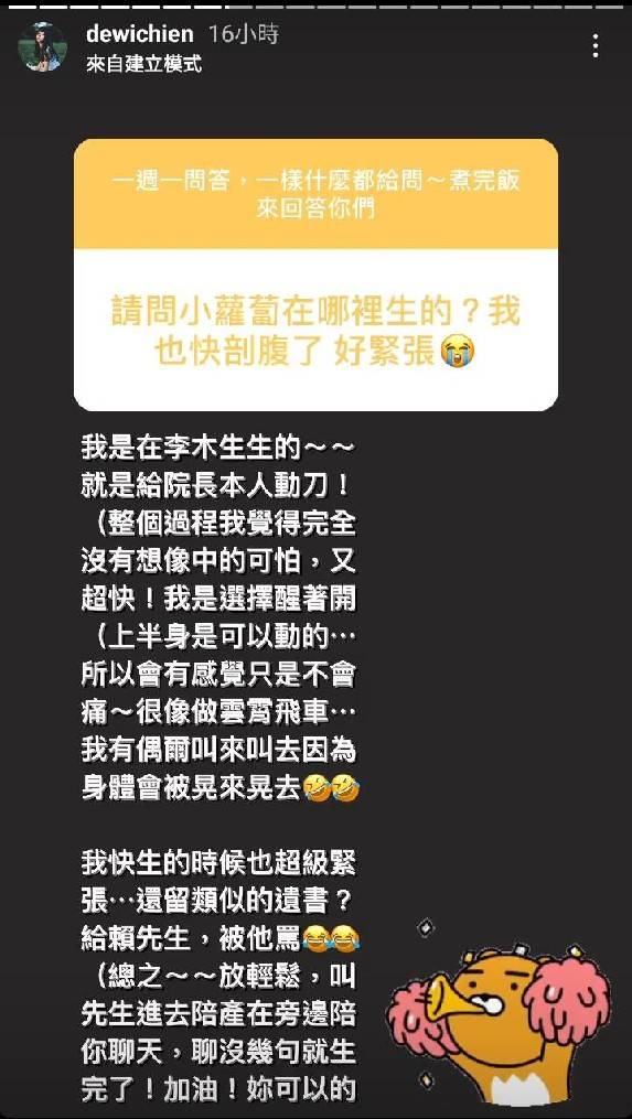 此外簡廷芮也表示當初會選擇剖腹產是因為由院長本人動刀讓她比較安心,加上過程中全程清醒、上半身還可以動,「很像坐雲霄飛車…我有偶爾叫來叫去,因為身體會被晃來晃去」。不過即使如此簡廷芮坦言產前還是相當緊張,甚至來還留下類似遺書的信件給老公,也因此被老公罵了一頓。