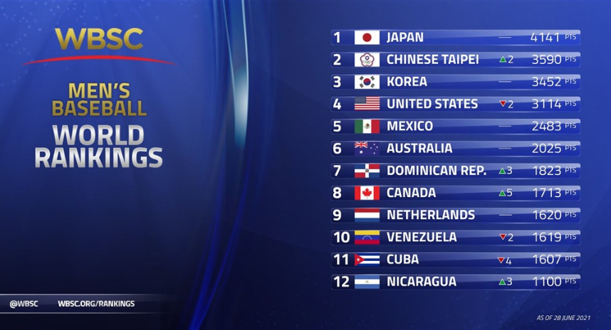 今年世界排名冠軍由日本以4141分位居棒壇龍頭,台灣與美國排名互換以3590分躍居第2,也是史上最佳成績!第三名是南韓的3452分,美國則是3114分退到第4。不過今年因為新冠疫情影響,考量到選手安全,台灣決定退出奧運資格賽,無緣爭取東京奧運,隨著2024巴黎奧運確定已取消棒球比賽,台灣最快要等到2028年才有機會重返奧運。