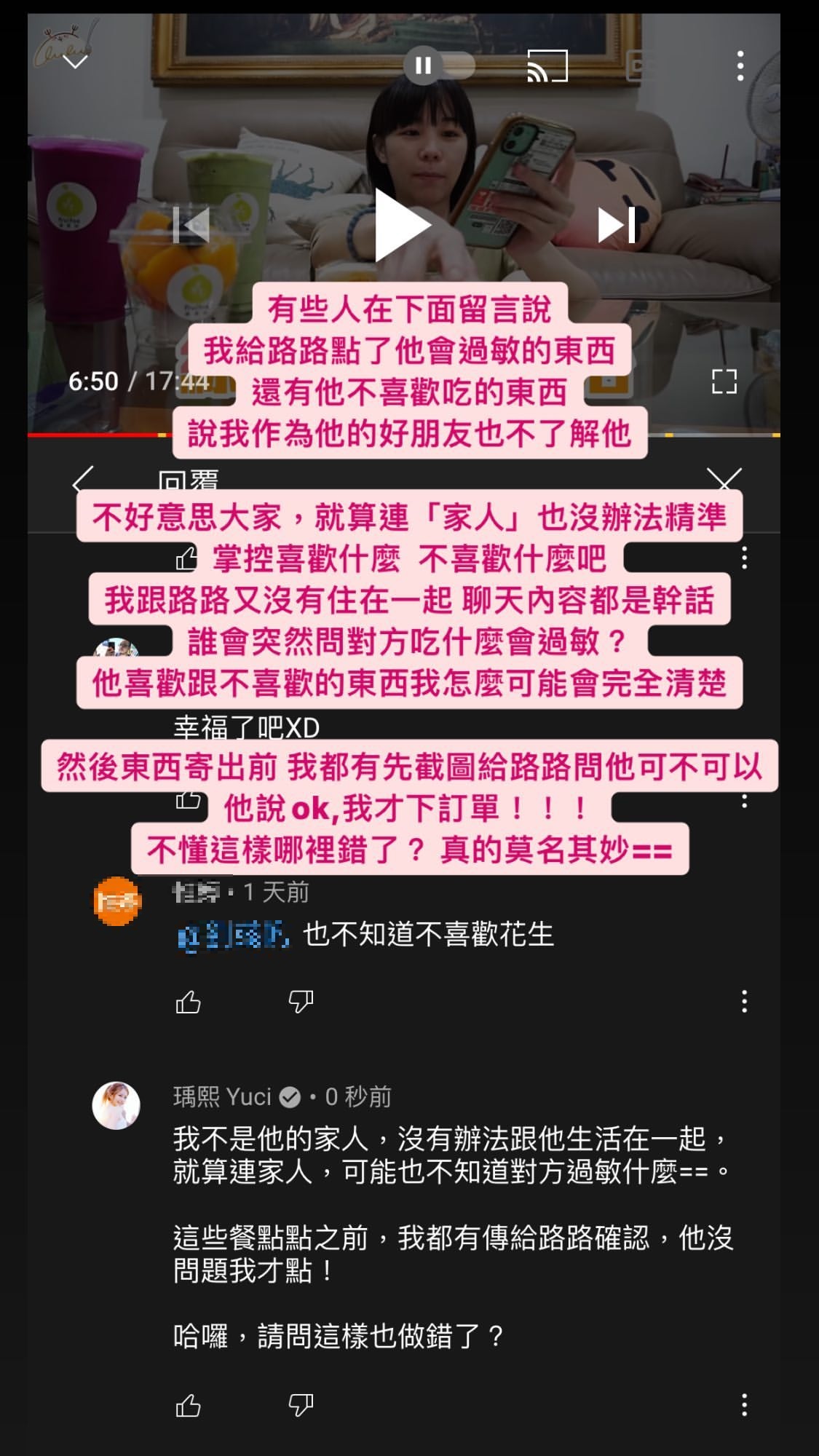 而路路也為了瑀熙而在IG限動中澄清:「我可以選擇不吃」,指出自己考量過影片效果等才選擇吃下瑀熙為她點的餐點。路路隨後再解釋,再好的朋友也會有對對方不夠了解的地方,「所以每一次的合作我都很珍惜,順便可以跟自己的朋友越來越了解」,希望網友不要用過於激動言論來謾罵任何人。