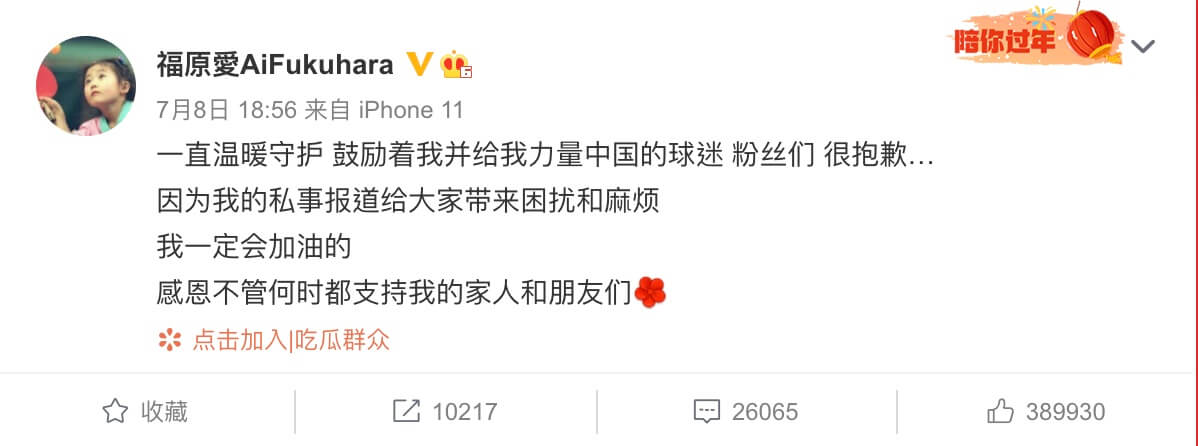 福原愛跟老公江宏傑兩人在8日共同宣布離婚消息,讓台灣、日本兩地的民眾都相當關注,不過福原愛在爆出婚變風波之後,便在社群上沈默了許久,沒想到在他們離婚消息衝上微博熱搜話題第一名時,她卻在8日晚上透過微博發文,跟一路以來支持她的中國粉絲們道歉,「因我的私事給大家帶來困擾跟麻煩,我一定會加油的!」引起不少網友們熱烈關注與討論。