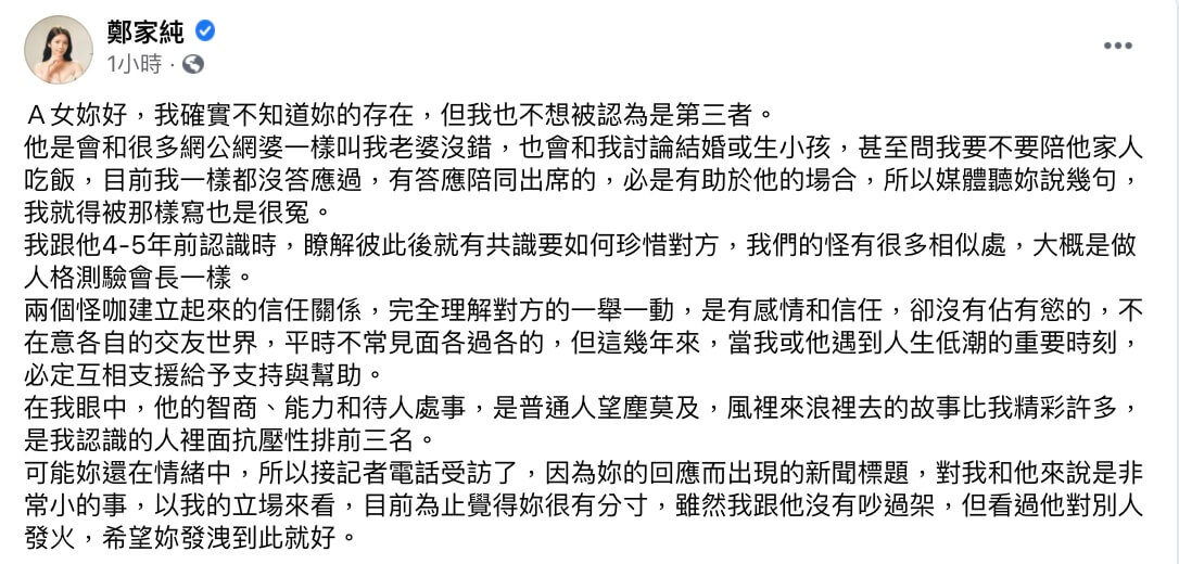雞排妹(鄭家純)14日被爆出新戀情,而且對象是早就有未婚妻的保時捷男,讓雞排妹成了第三者,而在消息曝光之後,引起了不少網友們的討論!雞排妹也為此在社群平台上發文,直接點名向媒體爆料的正宮A女,先是表明自己真的不知道對方的存在,也沒有想要被當作是小三,並向A女喊話,「以我的立場來看,目前為止覺得妳很有分寸,雖然我跟他沒有吵過架,但看過他對別人發火,希望妳發洩到此就好!」掀起熱烈關注!