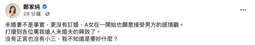 對於自己被爆出一連串的爆料,雞排妹也希望A女可以發洩到此就好,並且在14日二度發文寫道,「未婚妻不是事實,更沒有訂婚,A女在一開始也願意接受男方的感情觀。打擾到各位罵我搶人未婚夫的興致了,沒有正宮也沒有小三,我不知道是要吵什麼?」
