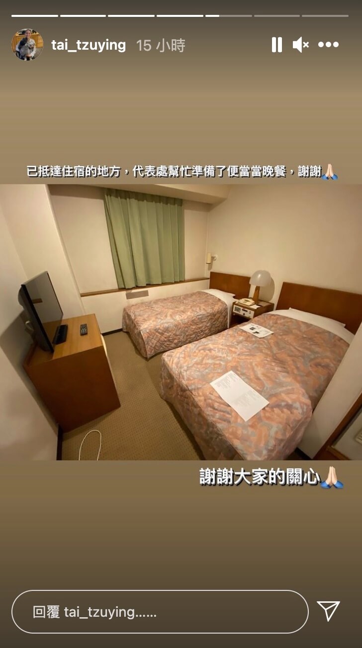 戴資穎19日曬出了自己抵達飯店的照片,跟大家報平安,「已抵達住宿的地方,代表處幫忙準備了便當當晚餐,謝謝!」從畫面中可以看到,房間裡面放了2張單人床、小床頭櫃、檯燈、電視,整體陳設相當精簡,整個房間看起來似乎沒有很大,而戴資穎也解釋,「這次為了離球場近一點,選擇不住選手村改住外面,這樣也能避免跟太多人接觸」。