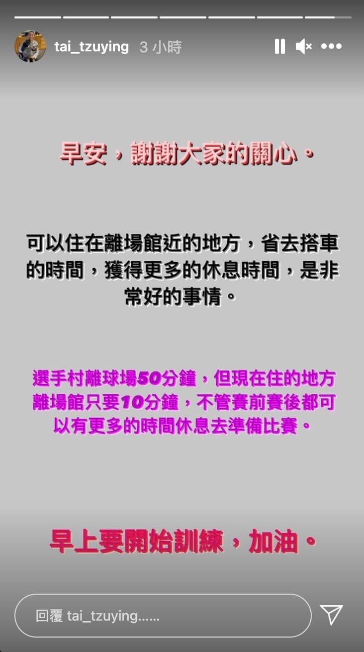 在住處引發熱議後,戴資穎也再度發文謝謝大家的關心並表示,「可以住在離場館近的地方,省去搭車的時間,獲得更多休息時間,是非常好的事情!」並解釋,「選手村離球場50分鐘,現在住的地方離場館10分鐘,不管賽前賽後,都可以有更多的時間休息去準備比賽,早上要開始訓練,加油!」讓大家明白她選擇住外面的原因。