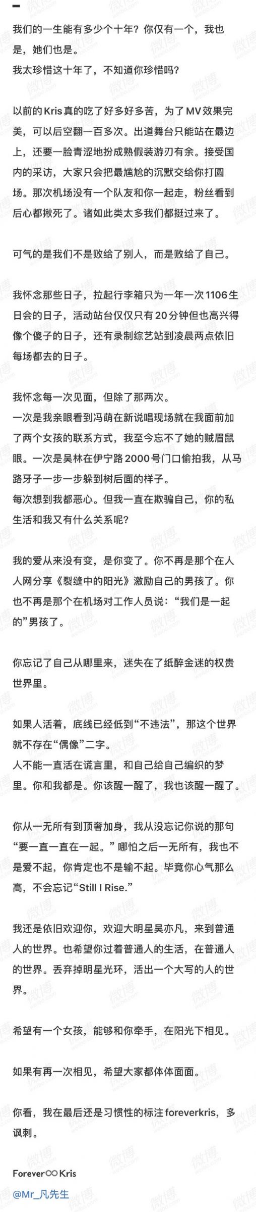 事件延燒多天,不少吳亦凡的粉絲也紛紛宣布脫粉,其中一名喜歡他長達10年的站姐更心碎寫下長文,透露在吳亦凡錄製《中國新說唱》時,曾親眼看到他的經紀人在她面前加了兩個女孩的聯繫方式,「我至今忘不了她的賊眉鼠眼」,另一次則是被吳亦凡的表哥跟蹤偷拍,從馬路轉角一路躲到樹叢後面,讓她憤怒寫下:「每次想到我都噁心。但我一直在欺騙自己,你的私生活和我又有什麼關係呢?」
