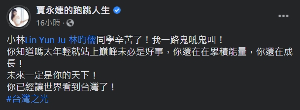 即使林昀儒最終無緣奪得銅牌,但精采的表現所有觀眾都有目共睹,賈永婕也不忘在臉書發文為小林同學打氣:,「小林同學辛苦了!我一路鬼吼鬼叫!你知道嗎太年輕就站上巔峰未必是好事,你還在在累積能量,你還在成長!未來一定是你的天下!你已經讓世界看到台灣了!」並在文末Hashtag「台灣之光」。
